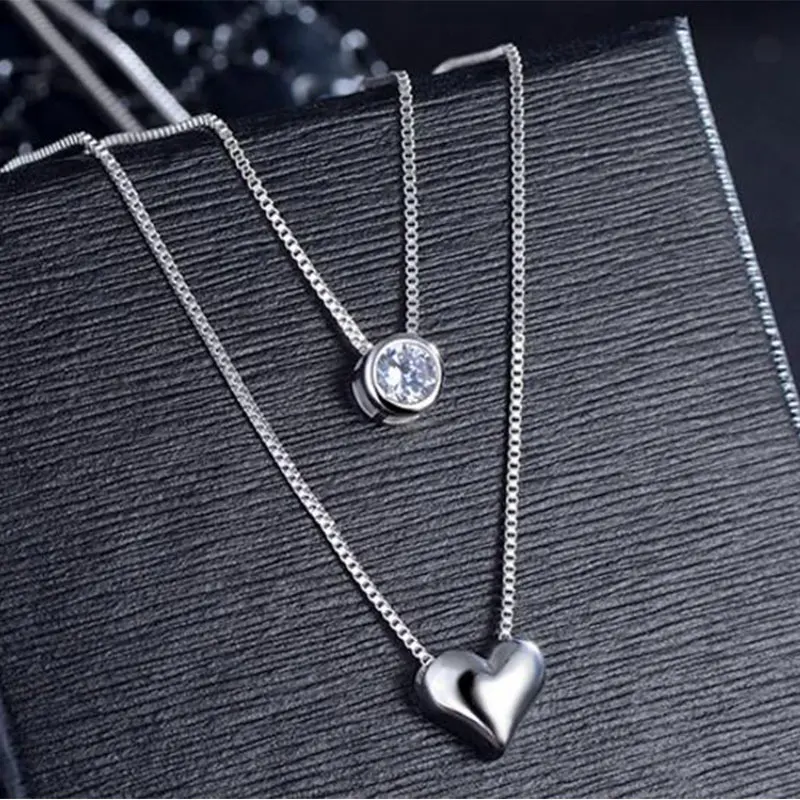 incredible Anenjery 925 Sterling Silver Necklace Double Layer Chain Zircon Heart Pendants Necklaces For Women